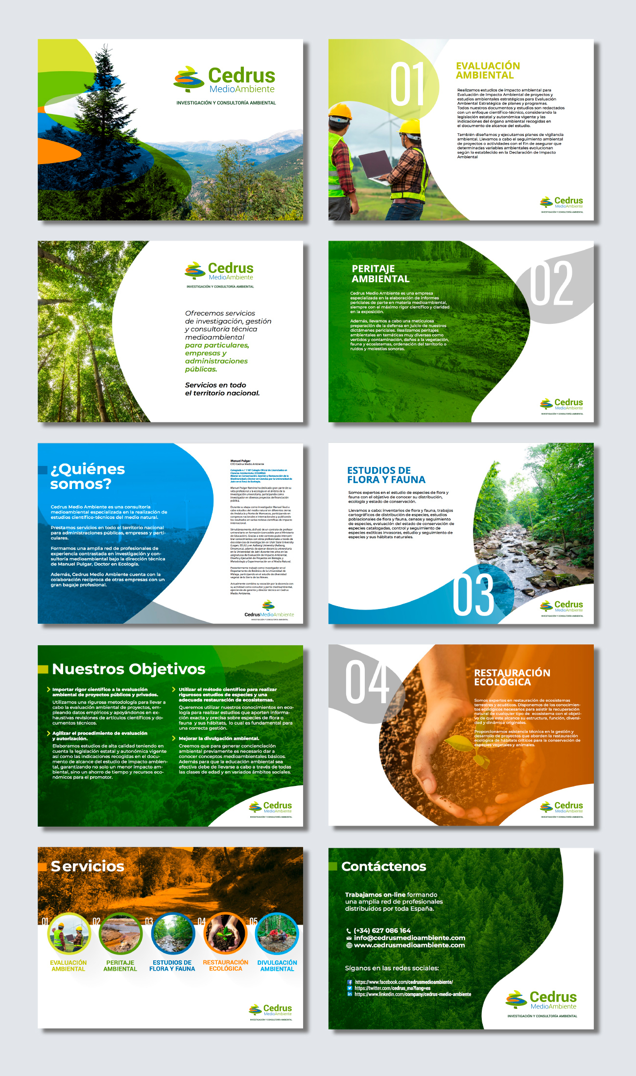 Diseño de logotipo y catálogo de empresa para Cedrus Medio Ambiente, una consultoría de Jaén que ofrece servicios de investigación, gestión y consultoría técnica medioambiental para particulares, empresas y administraciones públicas.