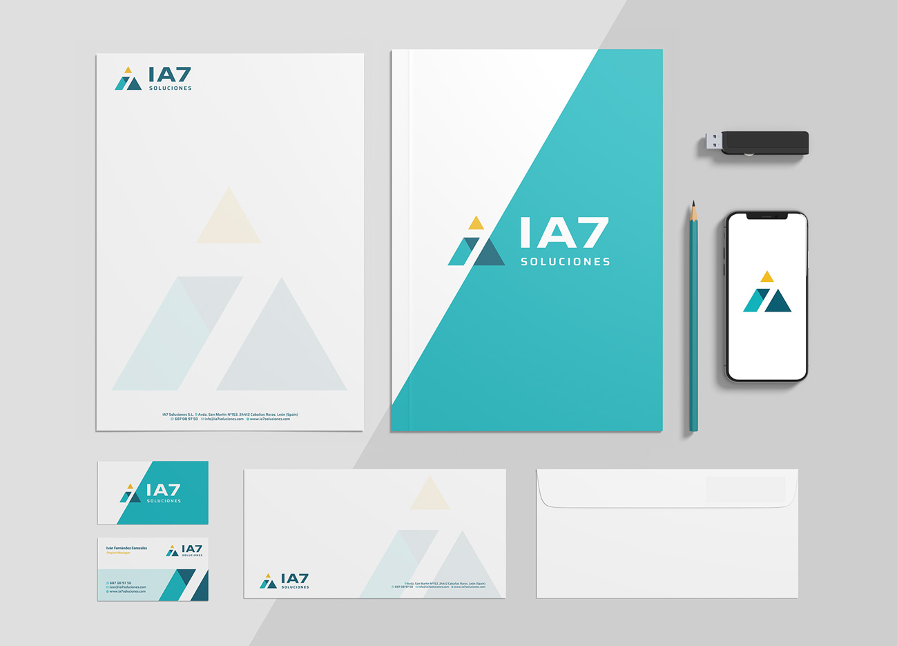 Diseño de logotipo y papelería corporativa para IA7 Soluciones, una empresa de ingeniería de diseño de procesos y maquinaria industrial para el sector alimentario y agroalimentario ubicada en la provincia de León. Realizan proyectos llave en mano y asesoramiento sobre la mejora de procesos.
